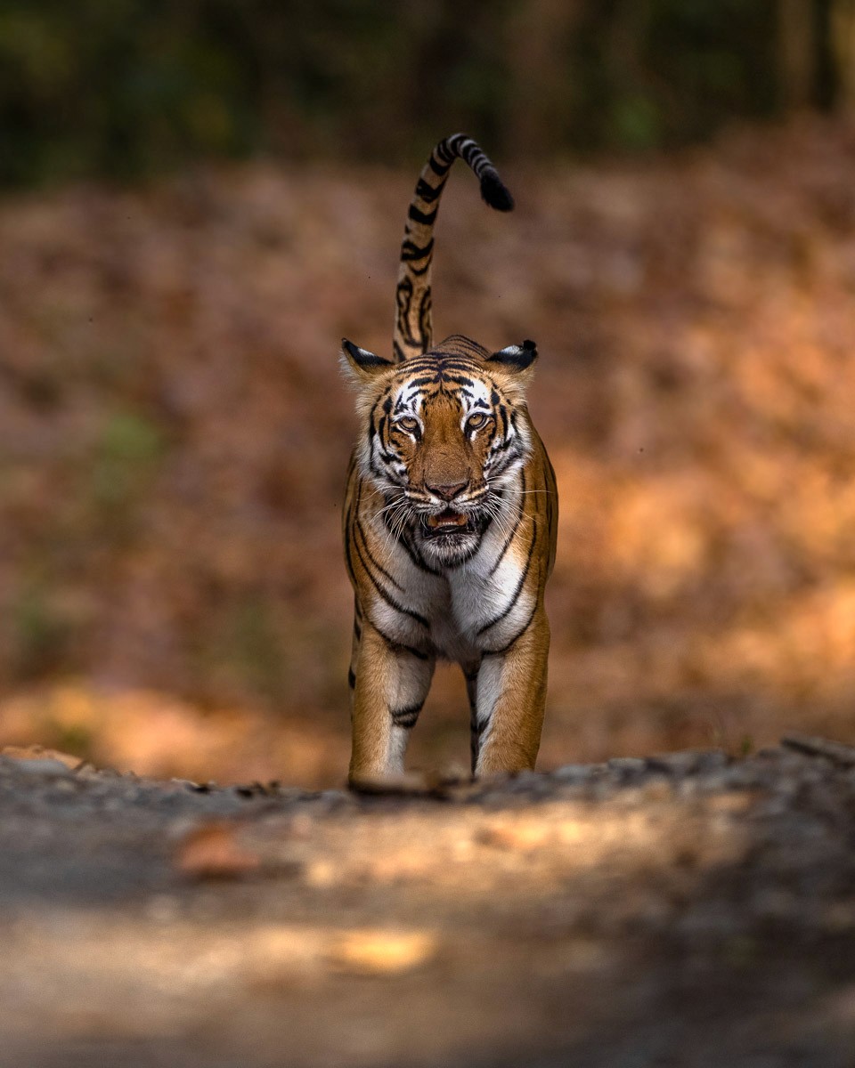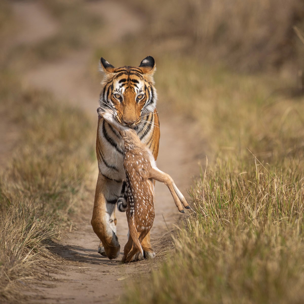 Photograph the Royal Bengal Tiger in open grasslands, riverbanks, and misty forest trails.